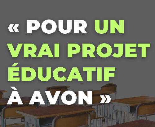 Notre projet éducatif place l’école au cœur de l’avenir d’Avon. Nous voulons bâtir un programme à la fois ambitieux et réaliste, fondé sur la solidarité, la lutte contre la pauvreté et la transmission des valeurs démocratiques. Notre objectif est clair : redonner à nos écoles les moyens de réussir, offrir à chaque enfant les mêmes chances et permettre à la ville de retrouver une véritable ambition collective.